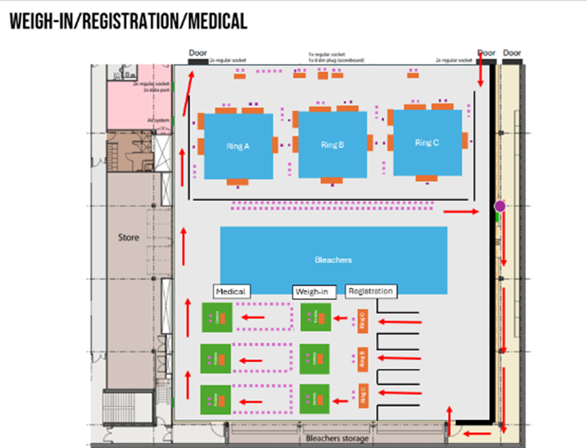 Please adhere to the relevant spectator and competitor entrances/exits as shown below. The warm-up area will be available behind the spectator seating once weigh-in has closed.