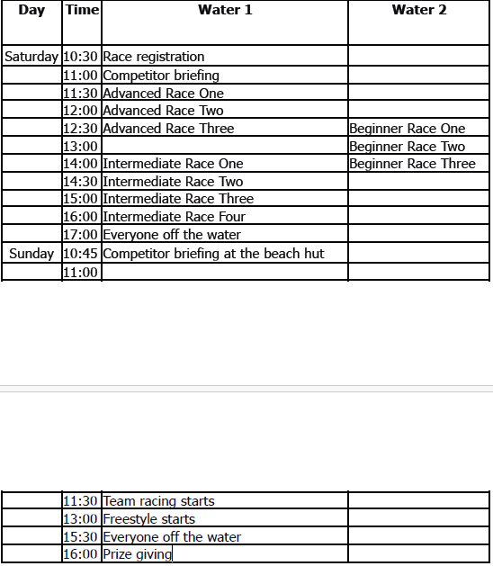 Please see below for the current timetable. Please note this is a draft, and the final timetable will be available the day before the event. This allows us to judge the weather conditions and suitably run the races according to the weather.